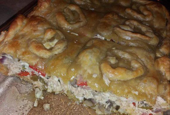 1 πακέτο φύλλο σφολιάτας 1 κοτόπουλο βρασμένο και ξεκοκαλλισμένο 1 φλιτζάνι φέτα τρίμμα 1 κονσερβα μανιτάρια ψιλοκομμενα 1 κρεµµύδι µεγάλο ψιλοκοµµένο 1 πιπεριά Φλωρίνης σε κυβάκια 2 πιπεριές πράσινες σε κυβάκια λίγο κρασί κόκκινο ξηρό 2 αβγά χτυπημένα 1 φλιτζάνι µαϊντανό ψιλοκοµµένο ή σέλινο αλάτι, πιπέρι, κανέλα ½ φλιτζάνι ελαιόλαδο 3 κουτ. σούπας βούτυρο λιωμένο 1 κρόκο αβγού ανακατεμένο με 2 κουταλιές νερό σουσάµι προαιρετικά