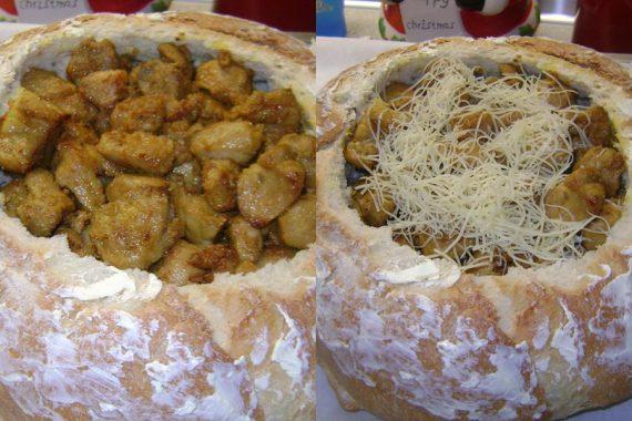 Αδειάζουμε την ψίχα μέσα από ένα καρβέλι και ρίχνουμε στην βάση του καρβελιού διάφορα τυριά της αρεσκείας μας. Βάζουμε μέσα την τηγανιά, το γεμίζουμε και πάλι με τυριά της αρεσκείας μας επάνω και στα πλαϊνά του.