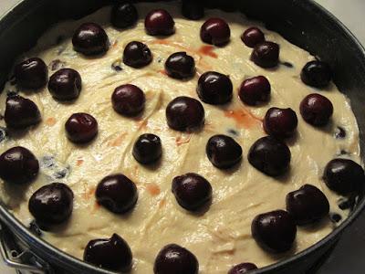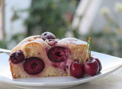 1 κούπα καλά γεμάτη ζάχαρη 125 γρ βούτυρο μαλακό η μισή πλάκα 2 αυγά 2 κουταλιές σούπας γλυκό του κουταλιού κεράσι η μαρμελάδα 2 κούπες αλεύρι που φουσκώνει μόνο του.250 γρ 300 γρ γιαούρτι με γεύση κεράσι 500 γρ κεράσια καθαρισμένα από τα κουκούτσια