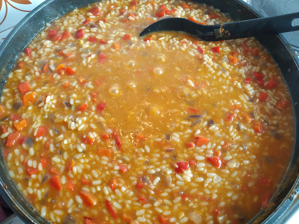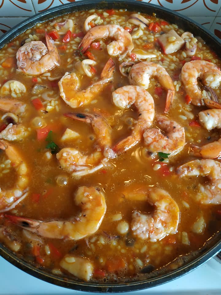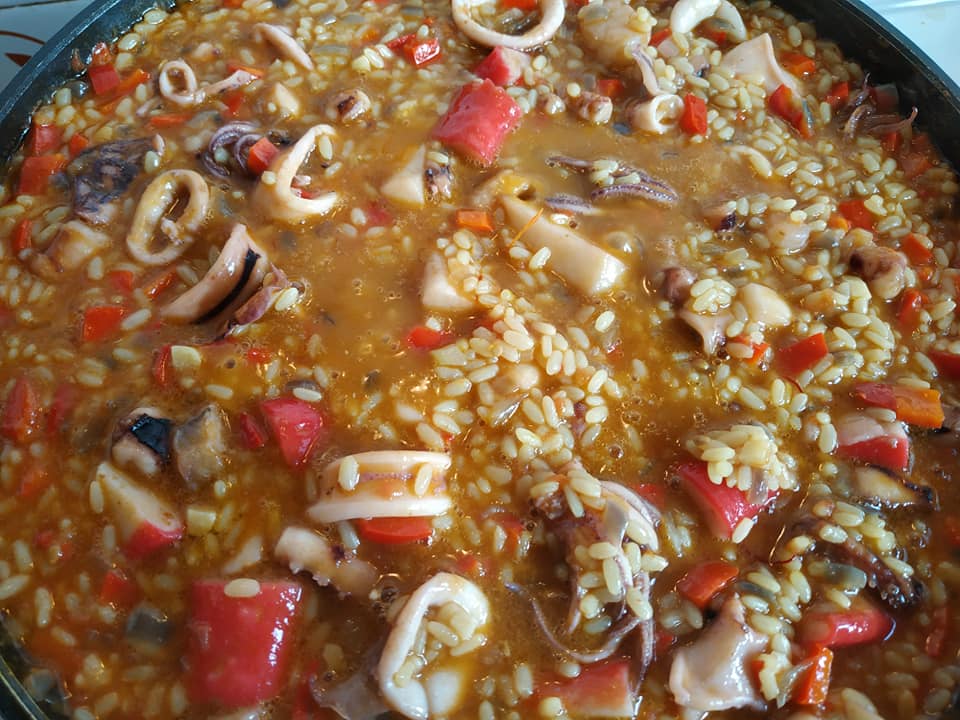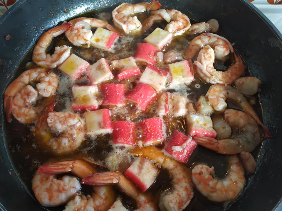 Σοτάρω ξεχωριστά σε λάδι μαζί με μια κουταλιά βούτυρο αρωματισμένο με γλυκιά πάπρικα και σαφράν, μισό κιλό γαρίδες, μισό κιλό καλαμαράκια φρέσκα και ένα πακέτο κατεψυγμένο μιξ θαλασσινών. Τα βγάζω σε ένα σκεύος κι αλατίζω από πάνω. Στο ίδιο λάδι σοτάρω ένα μεγάλο ψιλοκομμένο κρεμμύδι και τρεις σκελίδες σκόρδο. Όταν γυαλίσουν προσθέτω δύο ψιλοκομμένες πιπεριές Φλώρινης και δύο τριμμένες κόκκινες ντομάτες. Μετά από 5 λεπτά βάζω μαλακό κίτρινο ρύζι,σταδιακά το ζωμό από τα κεφάλια και το κέλυφος των ουρών της γαρίδας, αλατοπίπερο, λίγο κρόκο Κοζάνης ακόμη και σιγοβράζω για δέκα λεπτά. Ξαναβάζω τα θαλασσινά μου, ένα φύλλο δάφνης και σε 5 ακόμη λεπτά πριν το σβήσω βάζω μαϊντανό και άνηθο. Έγινε πολύ γευστικό, δεμένο κι αρωματικό χωρίς να χρησιμοποιήσω καθόλου κρασί ή έξτρα βούτυρο στο τέλος.