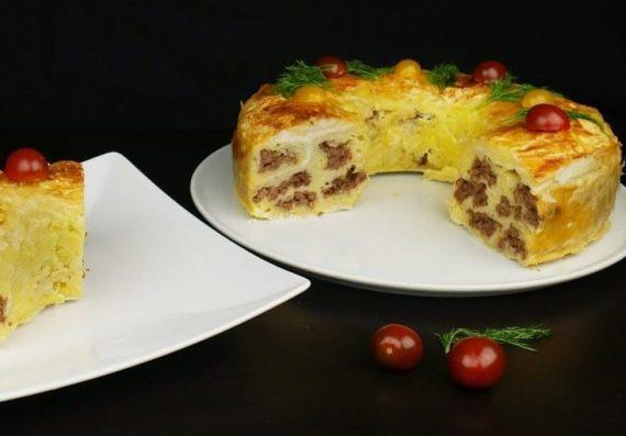 Χτυπάμε τα αυγά, προσθέτουμε το γάλα και ανακατεύουμε. Ενσωματώνουμε το γιαούρτι, βάζουμε το σιμιγδάλι, το μπέϊκιν και ανακατεύουμε. Καλύπτουμε την φόρμα για κέικ με 2 φύλλα και στο εσωτερικό βάζουμε ακόμα 2 φύλλα. Παίρνουμε 2 φύλλα μαζί και τα αλείφουμε με μείγμα αυγού. Στην μία πλευρά απλώνουμε κιμά και τυλίγουμε σε ρολό.