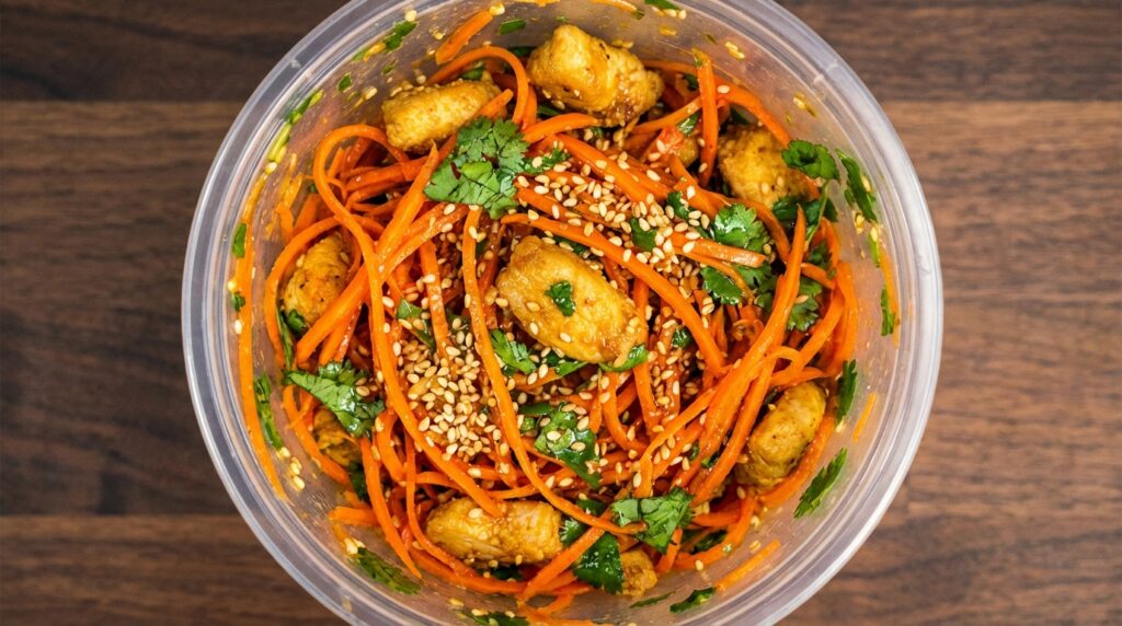Ρίχνουμε τις κομμένες λωρίδες καρότου σε ένα δοχείο 1 λίτρου με καπάκι. Ρίχνουμε το κρεμμύδι, το φρέσκο κρεμμυδάκι, ψημένο κοτόπουλο, σουσάμι, σόγια σος, ξίδι ρυζιού, μαϊντανό, σκελίδα σκόρδου, ελαιόλαδο, καυτερή σος, κλείσε το καπάκι και ανακίνησε πολύ καλά. Σέρβιρε και απόλαυσε αυτήν την πεντανόστιμη σαλάτα! Σας άρεσε αυτή η συνταγή; Πείτε μας την γνώμη σας στα σχόλια.