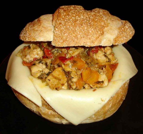 1 καρβέλι ψωμί 2 φιλέτα κοτόπουλου 3 καρότα 1 κρεμμύδι μεγάλο 3 πράσινες πιπεριές 2 κόκκινες πιπεριές 1 σκελίδα σκόρδο Μαϊντανό Θυμάρι Σκόνη μουστάρδας Κόκκινο πιπέρι Ρίγανη Αλάτι Λευκό βαλσάμικο Προεραιτικά ντοματίνια Φέτες κασέρι