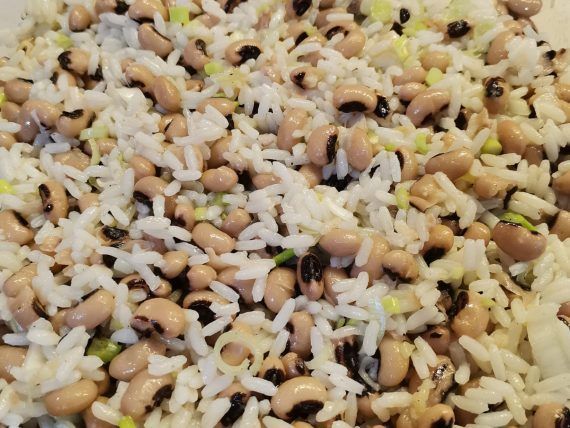 Βράζουμε τα μαυρομάτικα φασόλια όπως συνήθως, τα σουρώνουμε και τα αφήνουμε να κρυώσουν. Ανακατεύουμε σε μία πιατέλα τα φασόλια, το βρασμένο ρύζι, τα ψιλοκομμένα φρέσκα κρεμμυδάκια, τις γεμιστές ελιές σε φετάκια και τον ψιλοκομμένο δυόσμο.
