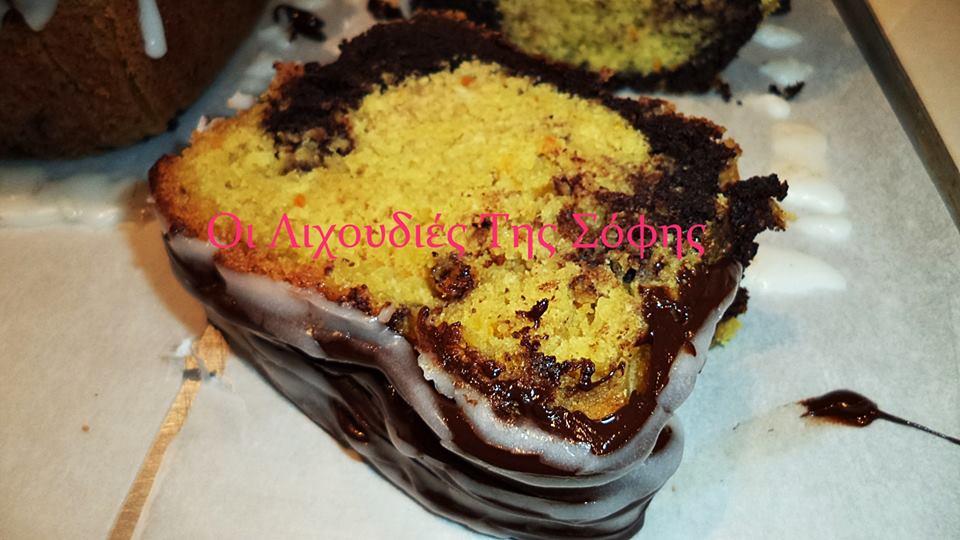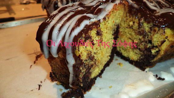 -Κοσκινίζω το αλεύρι και το ανακατεύω με το αλάτι,βανίλιες,και σόδα. -Σένα άλλο μπολ ρίχνω το λάδι.τον χυμό πορτοκαλιού,την ζάχαρη και το ξύσμα και ανακατεύω με σύρμα.Προσθέτω και το αλεύρι και ανακατεύω μέχρι να ενωθούν τα υλικά και σταματώ, Κρατώ ι κούπα από το μίγμα και μέσα εκεί ρίχνω και ανακατεύω το κακάο. Ρίχνω σε μια μεγάλη μακρόστενη ή στρογγυλη λαδωμένη και αλευρωμένη φόρμα το λευκό μίγμα και από πάνω ρίχνω με κουταλιές το σοκολατένιο.Το ανακατεύω ελαφρά μένα πηρούνι να κάνω νερά και ψήνω στους 180 για 1 ώρα περίπου. Αφού κρυώσει καλά το ξεφορμάρω. Λίώνω σε μπεν μαρί την μαργαρίνη με τη σοκολάτα και γαρνίρω με γραμμές την επιφάνεια του κέικ .Μόλις στεκάρει λίγο η σοκολάτα και στεγνωσει ανακατεύω σ ένα μπολάκι την άχνη με το νερό να γίνει ένα παχυρευστο μιγμα και το ρίχνω κι αυτο πάνω στο κέικ.