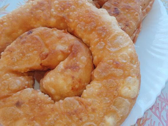 Στην συνέχεια ανοίγουμε με τον πλάστη σε φύλλο και πασπαλίζουμε το φύλλο με θρυμματισμένη κατσικίσια φέτα. Επαναλαμβάνουμε την ίδια διαδικασία και με τα άλλα φύλλα. Ρολάρουμε σε στριφτή τυρόπιτα και τηγανίζουμε σε μπόλικο ηλιέλαιο μέχρι να πάρουν χρυσό χρώμα.
