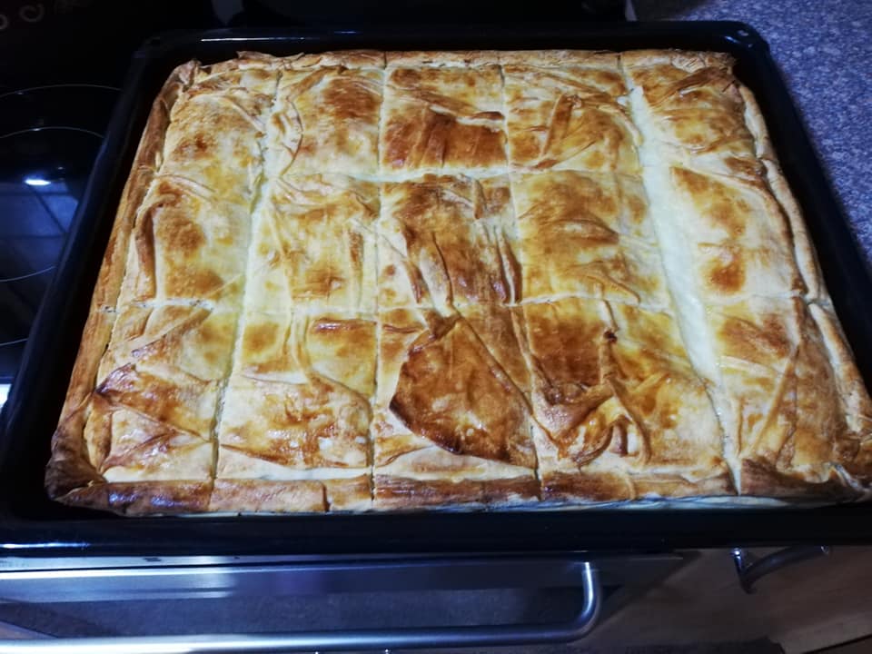 Στρώνουμε σε ένα ταψί μεγάλο 3 φύλλα κάτω ενδιάμεσα βουτυρωμένα και γεμίζουμε με την γέμιση και καλύπτουμε με τα υπόλοιπα 3 από πάνω πάλι βουτυρωμένα. Χτυπάμε ένα κρόκο με λίγο νεράκι αν θέλουμε η πίτα να γυαλίζει. Ψήνουμε στον αέρα στους 200 βαθμούς για περίπου 40 λεπτά.