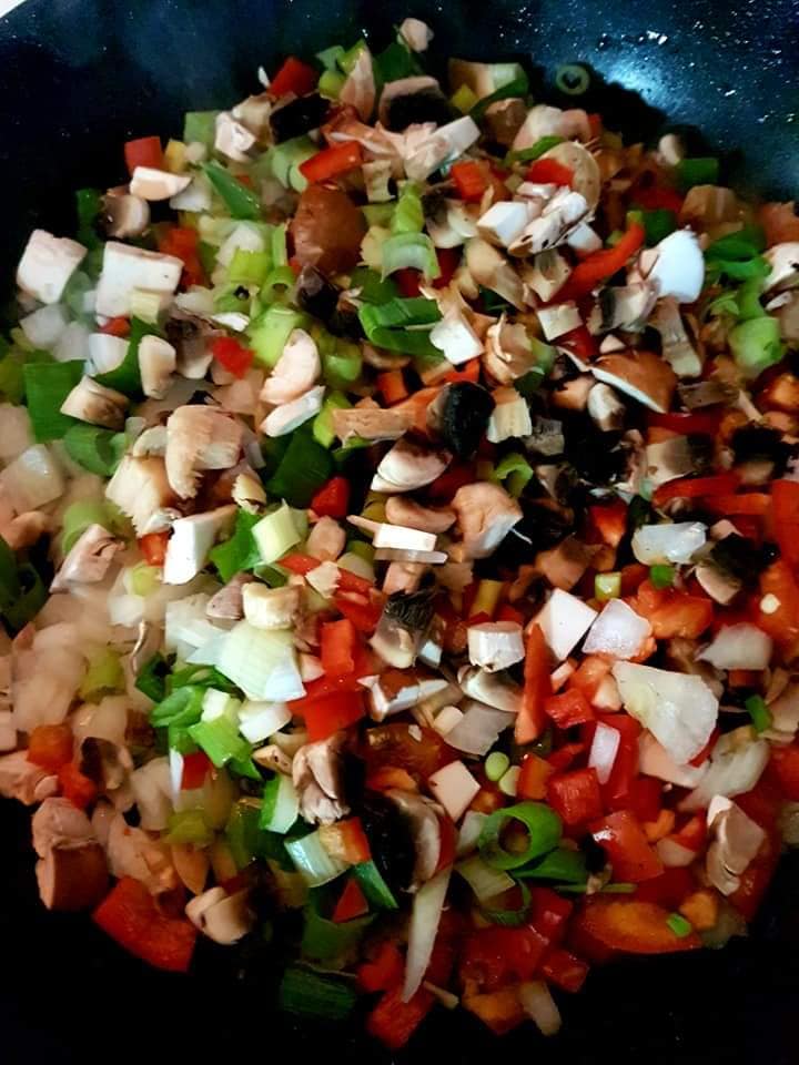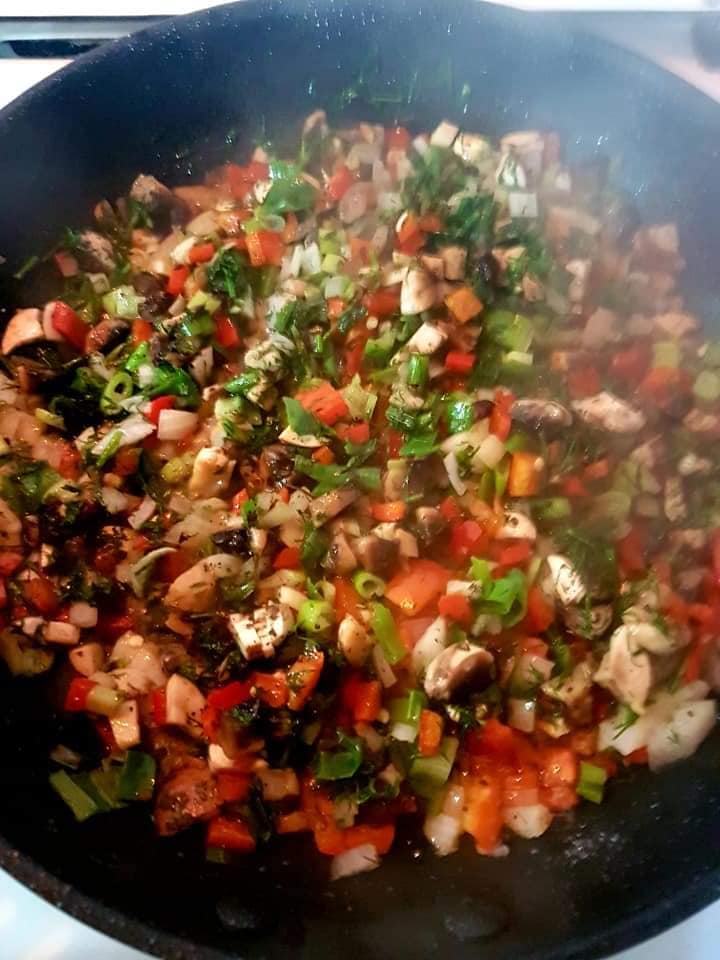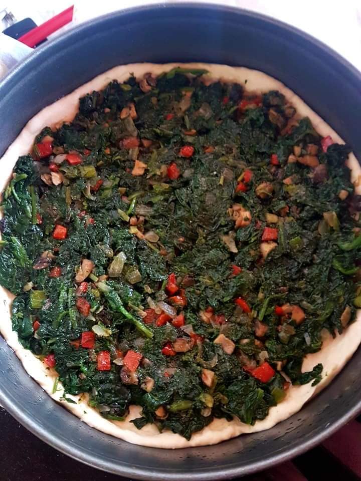 Σε αντικολλητικό τηγάνι έβαλα το κρεμμύδι, τα φρέσκα κρεμμυδάκια ,τον άνηθο, τις κόκκινες πιπεριές, τα άσπρα μανιτάρια ,τα πορτομπελο, το σκόρδο, το δυόσμο, το αλάτι και πιπέρι. Αφήνω για ένα τέταρτο ώσπου να μαλακώσουν τα λαχανικά και προσθέτω το σπανάκι με λίγο νερό, χαμηλώνω τη φωτιά και κλείνουμε το καπάκι για ένα τέταρτο.