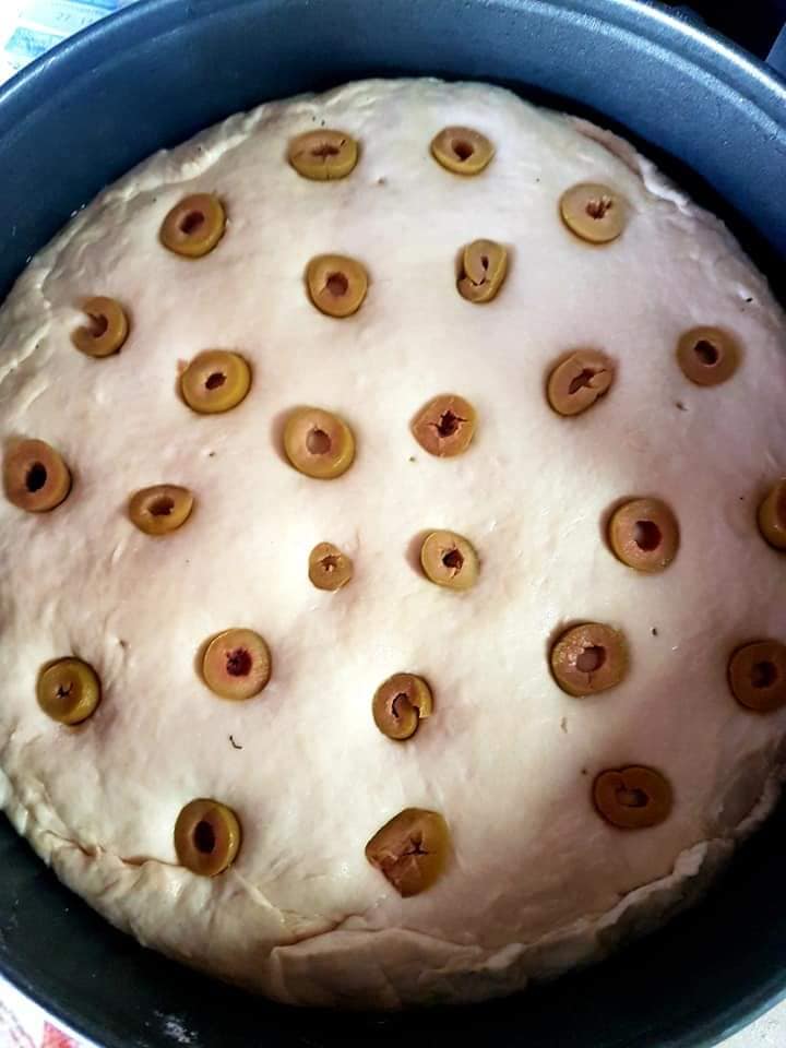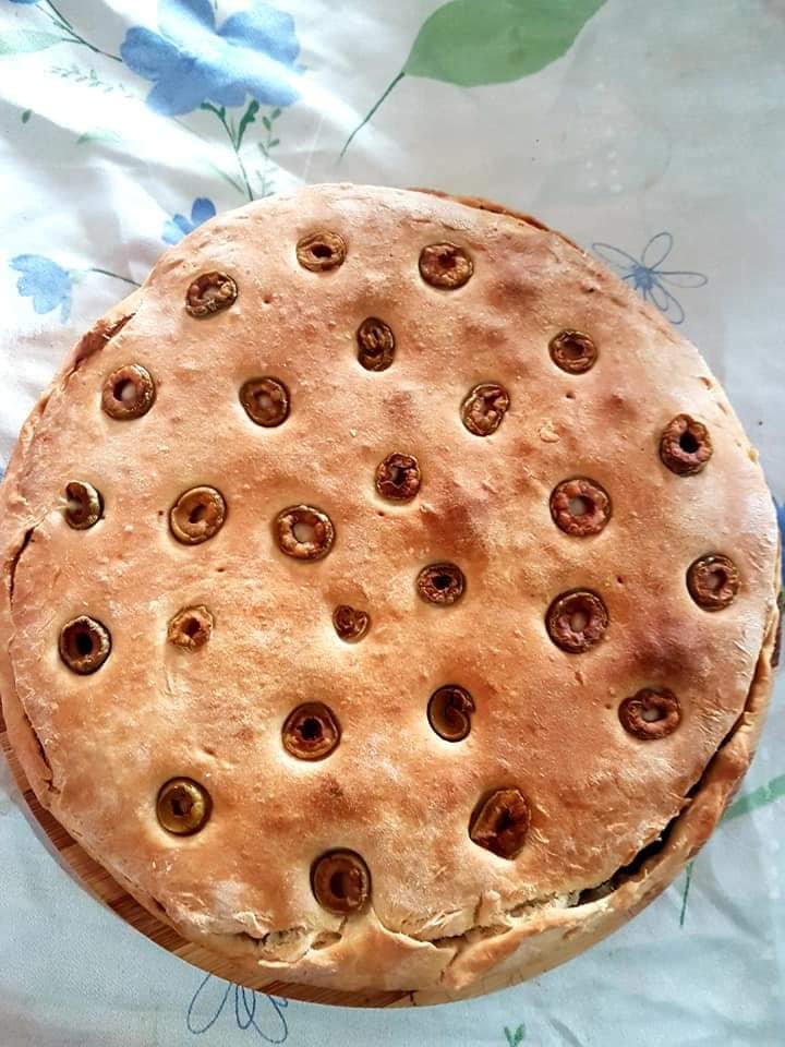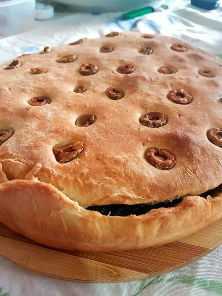 Τοποθετούμε το πρώτο φύλλο κάτω βάζουμε τη γέμιση και από πάνω το δεύτερο φύλλο. Με μία οδοντογλυφίδα τρυπάμε σε 6-7 σημεία. Αφήνουμε για μισή ώρα στην άκρη και μετά πασπαλίζουμε με ένα κρόκο (εγώ το ξέχασα) Βάζουμε τις ελιές και ψήνουμε στους 200 βαθμούς για 40 λεπτά περίπου.