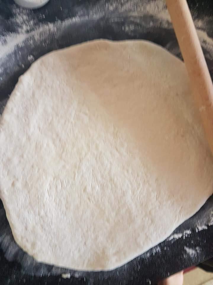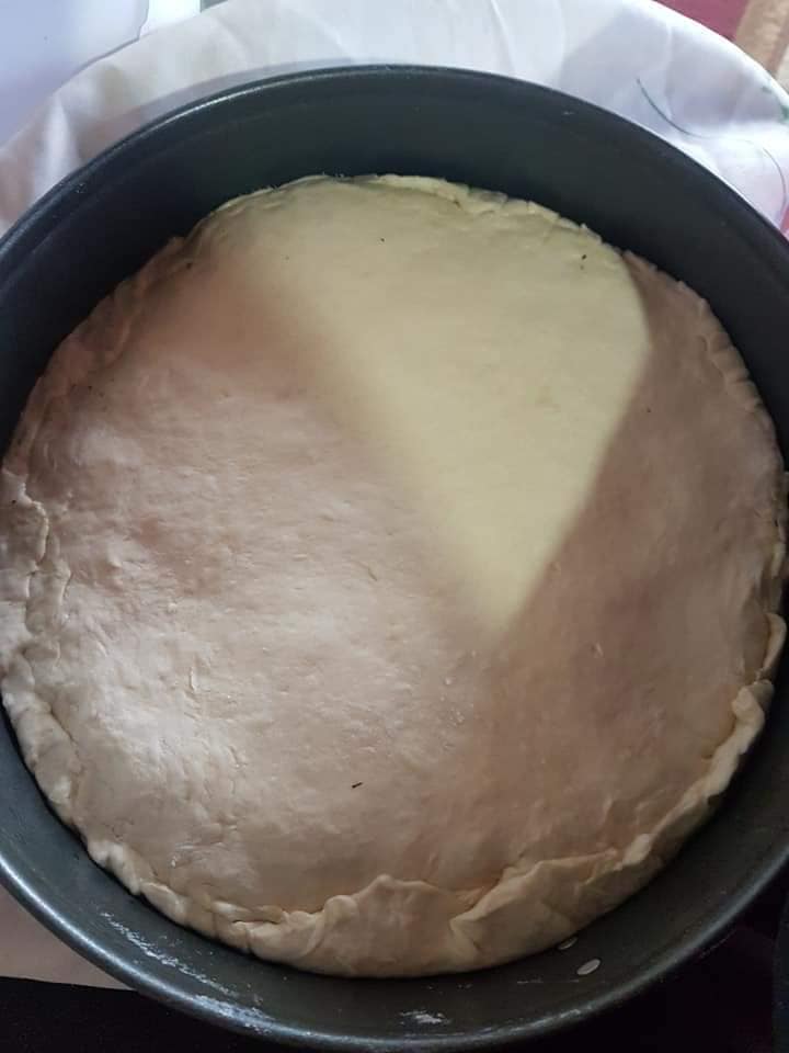 Στο χλιαρό νερό διαλύουμε τη μάγια με τη ζάχαρη και λίγο από το αλεύρι (ξεκινήστε με 500 γραμμάρια αλλά θα το βάζετε σταδιακά και τα ζυμώνετε) και αφήνουμε για 10 λεπτά να ενεργοποιηθεί. Στη συνέχεια προσθέτουμε σιγά-σιγά το αλεύρι το αλάτι και το σπορέλαιο. Όταν είναι έτοιμη η ζύμη τη χωρίζουμε σε δύο μπαλάκια και αφήνουμε για 10 λεπτά. Βουτυρώνουμε μία φόρμα του κέικ και ανοίγουμε δύο φύλλα ίσα με τη φόρμα.