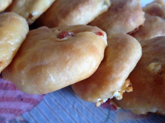 Εκτέλεση Ζυμωνουμε ολα τα υλικα μαζι μεχρι να εχουμε μια απαλη ζυμη Την αφηνουμε να φουσκωσει και στη συνεχεια ανοιγουμε ενα μεγαλο φυλλο. Κοβουμε κυκλους με μια κουπα και βαζουμε στο κεντρο απο μια κουταλια της γεμισης.Κλεινουμε σαν πουγκι,τα παταμε λιγο με τα χερια να πλατυνουν και τα βαζουμε σε ενα ταψι με την ενωση προς τα κατω. Αλειφουμε την επιφανεια με ενα χτυπημενο αυγο με λιγο λαδι.Ψηνουμε στους 180 βαθμους μεχρι να ροδισουν για περιπου 30