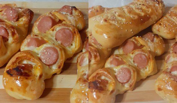 Στην συνέχεια χωρίζουμε την ζύμη σε 12 μπαλάκια. Σε αλευρωμένη επιφάνεια ανοίγουμε το πρώτο μπαλάκι ζύμη. Βάζουμε στο πρώτο μπαλάκι σάλτσα ντομάτας, λίγο τυρί τριμμένο και το λουκάνικο. Το κλείνουμε και το βάζουμε σε λαδόκολλα. Ακολουθούμε την ίδια διαδικασία και με τα υπόλοιπα μπαλάκια.