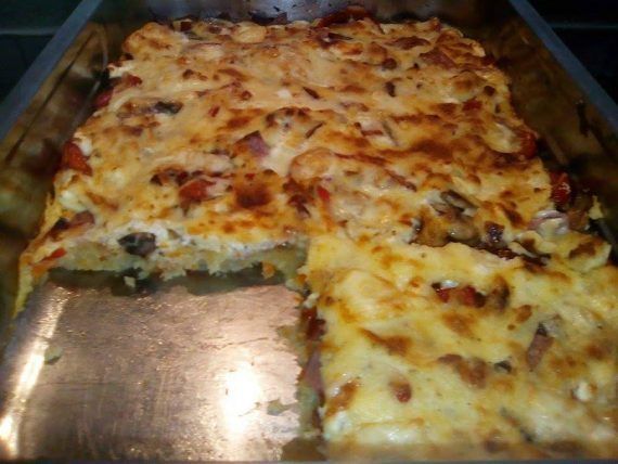 Βάζουμε ένα κατσαρολάκι στη φωτιά να κάψει και ζεσταίνουμε 3 κ.σ. βούτυρο. Μετά, ρίχνουμε 3 κ.σ. αλεύρι και ανακατεύουμε συνεχώς. Ρίχνουμε και το γάλα σιγά σιγά και συνεχίζουμε το ανακάτεμα. Κατεβάζουμε από τη φωτιά και ρίχνουμε ένα χτυπημένο αυγό. Ανακατεύουμε καλά την κρέμα μας και την απλώνουμε στο ταψί πάνω από τα υπόλοιπα υλικά. Τέλος, ρίχνουμε από την κρέμα λίγο ψιλοκομμένο κασέρι και ψήνουμε στον αέρα σε προθερμασμένο φούρνο στους 180 βαθμούς για 20 λεπτά.