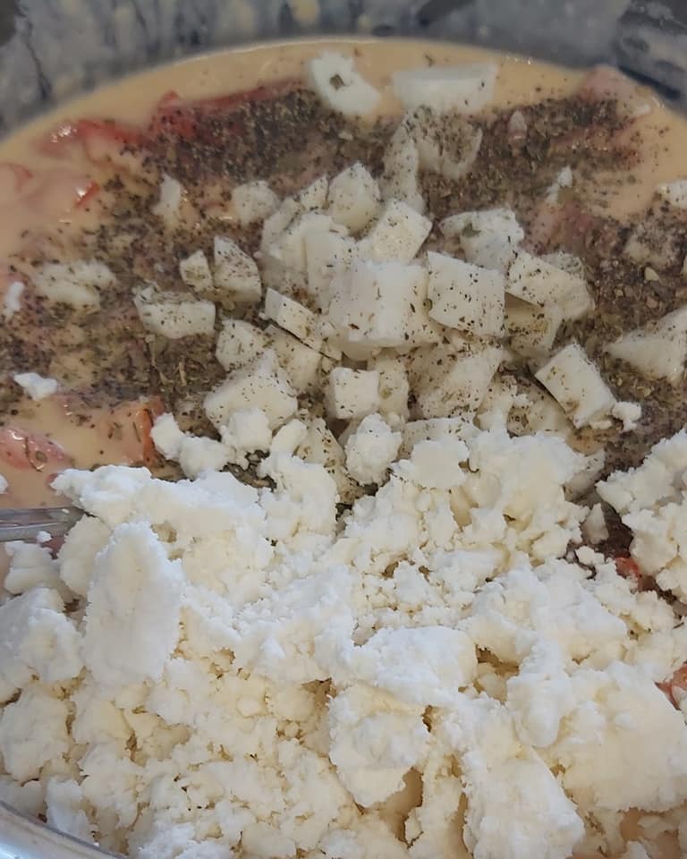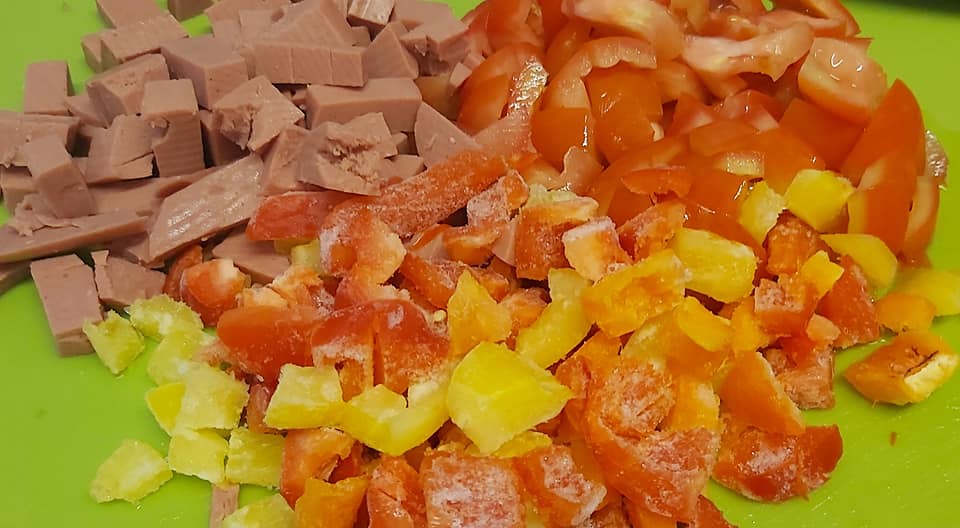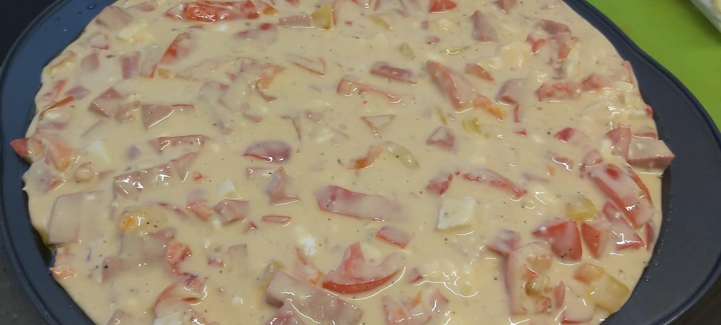 Στην αρχή ρίχνουμε τα αυγά σε ένα μπολ και τα χτυπάμε με τον αυγοδάρτη. Προσθέτουμε όλα τα υπόλοιπα υλικά και κάνουμε ένα παχύρρευστο μείγμα που μοιάζει με χυλό. Κόβουμε το luncheon meat, τις ντομάτες και τις πιπεριές μας σε ρόμβους και προσθέτουμε τα υλικά στον χυλό.