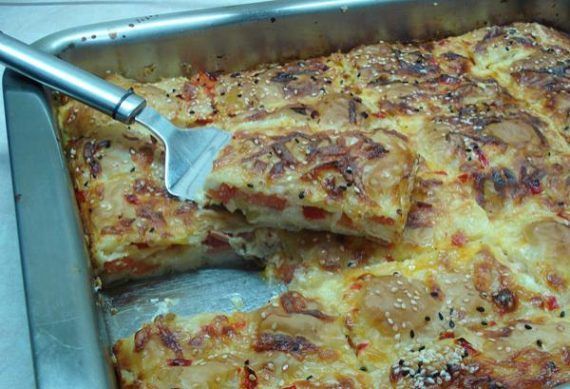 Κόβουμε το φύλλο στην μέση κάθετα ώστε να βάλουμε το μισό κάτω και το υπόλοιπο πάνω από την γέμιση. Λιώνουμε το βούτυρο και βουτυρώνουμε ένα ταψί. Στρώνουμε τα φύλλα που θα χρησιμοποιήσουμε για τον πάτο του ταψιού βουτυρώνοντας καλά. Βάζουμε όλα τα υλικά με την σειρά (εκτός το γάλα και τα αυγά), κρατάμε λίγο ρεγκάτο και κόκκινη πιπεριά για το τέλος. Καλύπτουμε με τα υπόλοιπα φύλλα βουτυρώνοντας καλά και κόβουμε σε κομμάτια την πίτσα. Χτυπάμε τα αυγά μαζί με το γάλα και περιχύνουμε την πίτσα μας. Τέλος πασπαλίζουμε με το τυρί και την πιπεριά που κρατήσαμε, ενώ αν θέλουμε πασπαλίζουμε και με σουσάμι. Αφήνουμε για 10 λεπτά να απορροφηθούν τα υγρά και ψήνουμε σε προθερμασμένο φούρνο στους 180 βαθμούς για 45 λεπτά περίπου, μέχρι να ροδίσει καλά (ανάλογα τον φούρνο μας). Αφήνουμε λίγο να κρυώσει κι είναι έτοιμη να την απολαύσουμε.