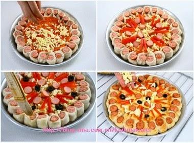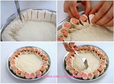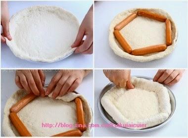 Εκτέλεση Λαδώνετε ένα ταψάκι και αφού είναι έτοιμη η ζύμη μας ,ανοίγουμε και απλώνουμε στα τοιχωματα Τοποθετούμε τα λουκάνικα όπως στη δεύτερη φωτογραφία Κλείνουμε με τη ζύμη (και αν θέλουμε με λίγο ασπράδι χτυπημένο αυγού και ένα πινελάκι κολλάμε στην ουσία τα τοιχώματα