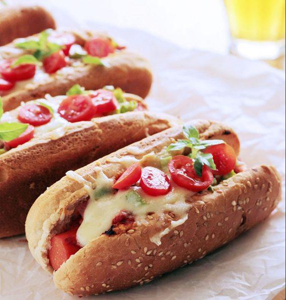 Τα pizza hot dogs περιέχουν μερικά χαρακτηριστικά υλικά πίτσας… κόκκινη σάλτσα με ντομάτα και βασιλικό, μπέικον, πράσινη πιπεριά και τριμμένη μοτσαρέλα βεβαίως-βεβαίως! Ετοιμάζονται γρήγορα. 40’ χρονομετρημένα. Επιδέχονται πολλές παραλλαγές. Η δεύτερη αγαπημένη μας είναι με κόκκινη σάλτσα ντομάτας, μια σπιρτόζικη γραβιέρα και πικάντικο σαλάμι Λευκάδος.