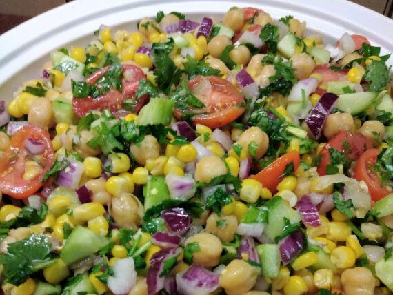 Σε μία σαλατιέρα βάζουμε τα βρασμένα ρεβίθια. Προσθέτουμε τα ντοματίνια κομμένα στην μέση, το αγγούρι κομμένο σε ροδέλες, το ξερό κρεμμύδι κομμένο σε ροδέλες, το καλαμπόκι, το ξύσμα λεμονιού, τον ψιλοκομμένο μαϊντανό, τον κόλιανδρο και το κάρδαμο και ανακατεύουμε.