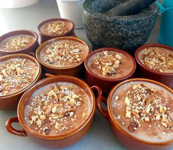 Αντί για κορν φλάουρ μπορούμε να βάλουμε αλεύρι για όλες τις χρήσεις. Τα υγρά πρέπει να είναι περίπου 2 λίτρα. Για το σερβίρισμα θέλουμε λίγο από το αλεσμένο μίγμα καρύδι σουσάμι και λίγο κανέλα. Αλλά μπορούμε να χρησιμοποιήσουμε και άλλους ξηρούς καρπούς και ρόδι.