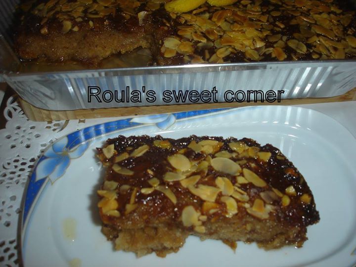 Τοποθετείτε σε μικρο ταψάκι λαδωμένο..στρώνετε ομοιομορφα..πασπαλίζετε αν θέλετε με αμυγδαλακι φιλε η καρύδι πολύ λεπτοκομμενο και ψήνετε στον φούρνο για περίπου 30-40. Αφού την αφήσουμε λίγο να ηρεμήσει ρίχνουμε με ένα κουτάλι απαλά και προσεκτικά το σιρόπι..αν δείτε να περισσεύει μην ανησυχείτε θα το πιει ολο..αφήνουμε στην άκρη ξεσκέπαστη κι αφού πιει όλο το σιρόπι την βάζουμε ψυγείο..σερβίρουμε με σαντιγί η παγωτο.η και σκέτη.. καλη επιτυχια Ρούλα Ψιττάκη