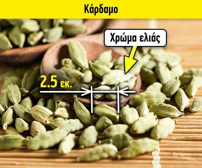 Το κάρδαμο πρέπει να έχει ένα πρασινωπό χρώμα σαν της ελιάς. Το έντονο πράσινο χρώμα μπορεί να σημαίνει, ότι έχει τεχνητές χρωστικές ουσίες.