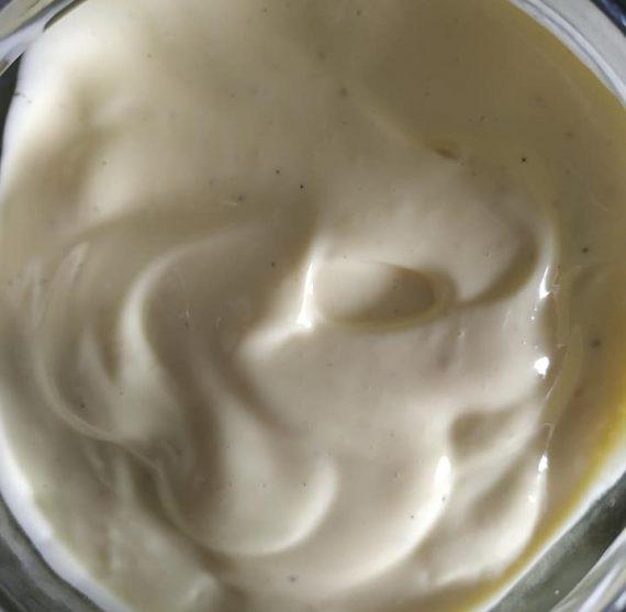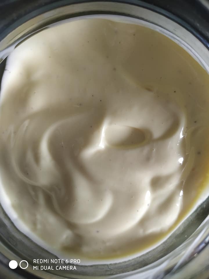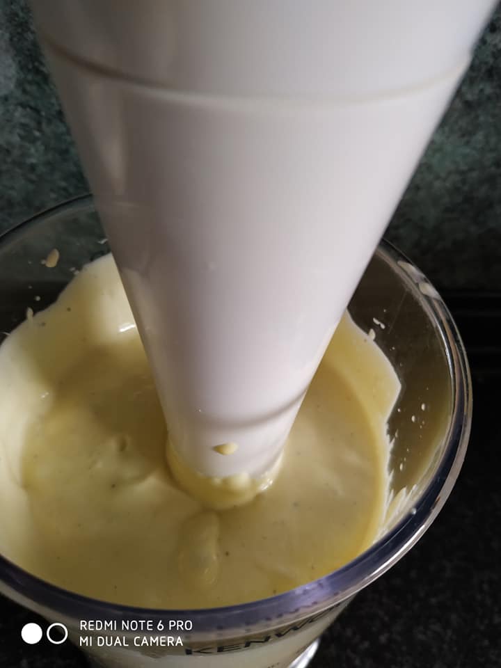 Μετράμε όλα τα υλικά και τα βάζουμε στο μπολ του ραβδομπλέντερ εκτός από το ηλιέλαιο. Απαραίτητη προϋπόθεση να έχουν όλα τα υλικά θερμοκρασία δωματίου, ξεκινάμε το χτύπημα στη δυνατή ταχύτητα και συμπληρώνουμε το ηλιέλαιο σε δόσεις χωρίς να σταματάμε το χτύπημα, όταν μπει όλο το λάδι χτυπάμε λίγο ακόμη και έτοιμη. Αδειάζουμε σε γυάλινο βάζο και διατηρούμε στο ψυγείο.