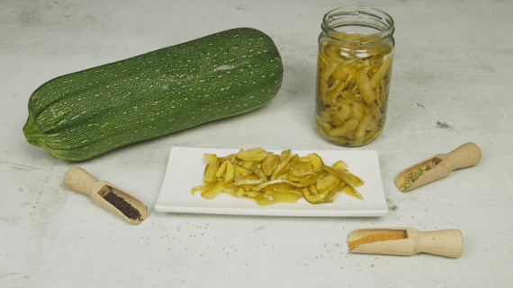 Κόβουμε τις άκρες από τα κολοκύθια και αφαιρούμε τα σπόρια. Τα κόβουμε σε λεπτές φέτες και τα βάζουμε σε ένα σκεύους μαζί με το αλάτι. Ανακατεύουμε και καλύπτουμε με ένα πιάτο (το πιάτο να δημιουργεί πίεση στα κολοκυθάκια). Αφήνουμε για 2½ ώρες και με τα χέρια μας στραγγίζουμε πολλή καλά να φύγουν τα υγρά. Σε καθαρό σκεύος βάζουμε τα κολοκυθάκια μαζί με το ξύδι και καλύπτουμε με ένα πιάτο (το πιάτο να δημιουργεί πίεση στα κολοκυθάκια).