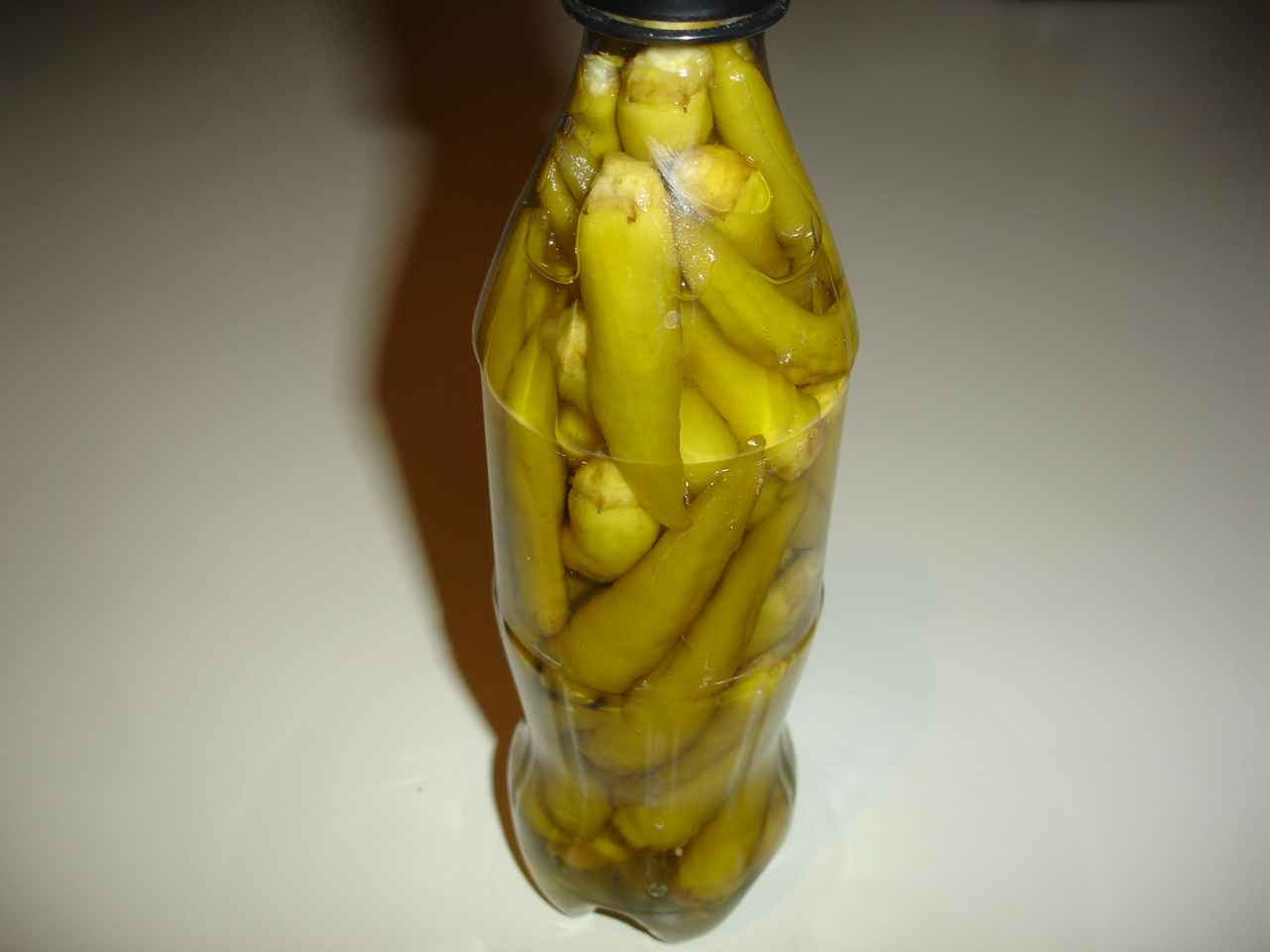 Παίρνουμε πικάντικες πιπεριές, τις λεγόμενες “μπακάλικες”, και τις τοποθετούμε σε μικρά πλαστικά μπουκαλάκια από αναψυκτικά, προσπαθώντας να τα γεμίσουμε με όσες περισσότερες μπορούμε.