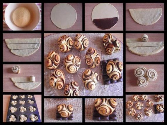 Βήμα 5 Ανοίξτε το κάθε μπαλάκι σε κυκλικό σχήμα με διάμετρο 13-15 εκατοστά (5-6). Αλέιψτε μισό μέρος ζύμης του κάθε κύκλου με την λιωμένη σοκολάτα και στη συνέχεια το διπλώνουμε στη μέση, καλύπτονταςτο έτσι ώστε να πάρει σχήμα μισοφέγγαρου. Κόψτε τη ζύμη σε τρεις λωρίδες κατά μήκος. Τυλίγουμε την λωρίδα σε σχήμα τριαντάφυλλο λουλούδι. Πάρετε τα τρία μικρά τριαντάφυλλα μαζί και τοποθετείστε σε μια θήκη της φόρμας. Κάντε το ίδιο και με τα άλλα 17 τριανταφυλλα.