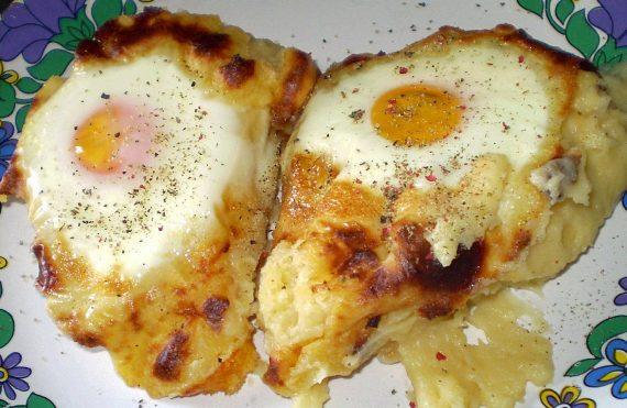 Απλώνουμε σε ένα ταψί τον πουρέ και ανοίγουμε λακκούβες ανάλογα με τα αυγά που θέλουμε να προσθέσουμε. Βάζουμε τα αυγά και το αφήνουμε στο φούρνο στους 200 βαθμούς μέχρι να ασπρίσουν τα αυγά. Τα αφήνουμε ανάλογα με το πόσο καλά ψημένα θέλουμε τα αυγά μας.