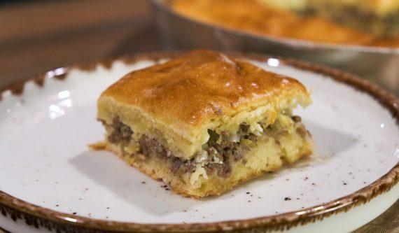 Zutaten 750 g Mehl 330 g Club Soda 20 g Backpulver 1 EL Salz 170 g Butter (kalt) ———————————- —————— 2 mittlere Lauch 1 große Zwiebel Ein bisschen Petersilie Salz + Pfeffer 500 g Rinderhackfleisch 50 g Olivenöl 150 g griechischer Feta 80 g Butter ——————————- 1 Eigelb + 2 EL Milch 35 cm.
