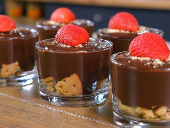 150 g Digestive free sugar ————————————————— 1 liter milk 90 g cornstarch 100 g cocoa powder 150 g stevia 1:2 2 vanilla ————————————————— Crushed digestive free sugar Strawberries