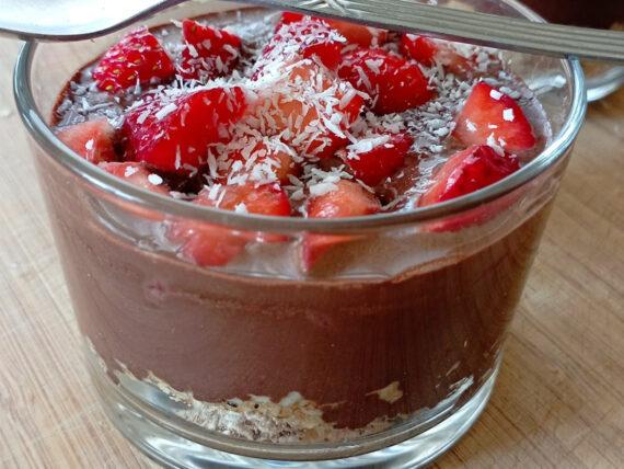 Σε μικρά ποτηράκια βάζουμε στη βάση 2-3 κουταλιές της σούπας βρώμη και από πάνω μους σοκολάτας. Βάζουμε στο ψυγείο να παγώσουν καλά τουλάχιστον 3 ώρες και γαρνίρουμε με φρέσκιες ψιλοκομμένες φράουλες και καρύδα τριμμένη!!!!.