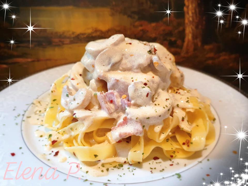 Κόβετε το ψαρονέφρι σε ροδέλες και το σωτάρετε σε ελαιόλαδο καλά και απο ταωδυο πλευρές, να πάρει χρώμα. Το αφαιρείτε από το σκεύος και το βάζετε σε σε ενα πιάτο. Στο ίδιο σκεύος σωτάρετε το μπέικον για 3 λεπτά και μετά ρίχνετε τα μανιτάρια. Σωτάρετε τα μανιτάρια καλά χωρίς να ανακατεύουμε πολύ γιατί θα βγάλουν πολλα υγρά. Σβήνουμε με το κρασί. Αφήνουμε να εξατμιστεί το αλκοόλ και προσθέτουμε το κρέας με τα υγρά που έχει βγάλει. Αλατοπιπερώνουμε στη προτίμηση μας και περιχύνουμε με τη κρέμα γάλακτος. Πασπαλίζουμε με παρμεζάνα και φροντίζουμε το κρέας να βρίσκετε μέσα στη κρέμα. Κλείνουμε με το καπάκι και αφήνουμε σε μέτρια φωτιά να βράσει για 10 λεπτά. Σερβίρουμε με ταλιατελες, ρύζι ή πουρέ. Είναι πραγματικά εύκολο και πεντανόστιμο φαγάκι! Καλή επιτυχία!!