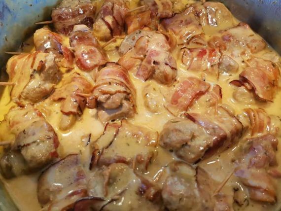 Στο τέλος βάζουμε τη μουστάρδα την οποία έχουμε ανακατέψει με τη κρέμα γάλακτος. Αφήνουμε να πάρει μία καλή βράση και αποσύρουμε το τηγάνι από τη φωτιά. Αφαιρούμε τις οδοντογλυφίδες και απολαμβάνουμε σκέτο, με άγριο ρύζι, ρύζι λαχανικών ή τηγανιτές πατάτες.