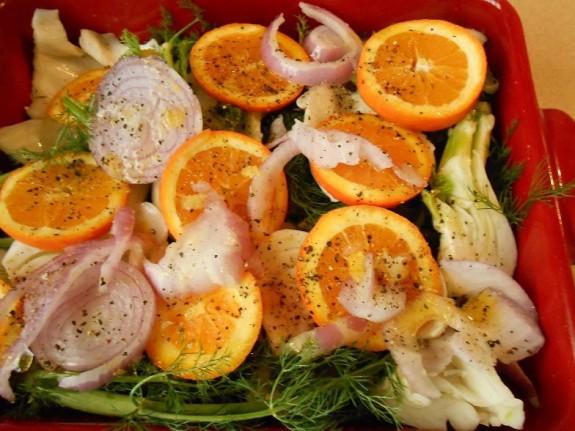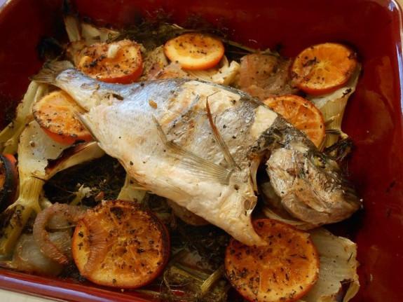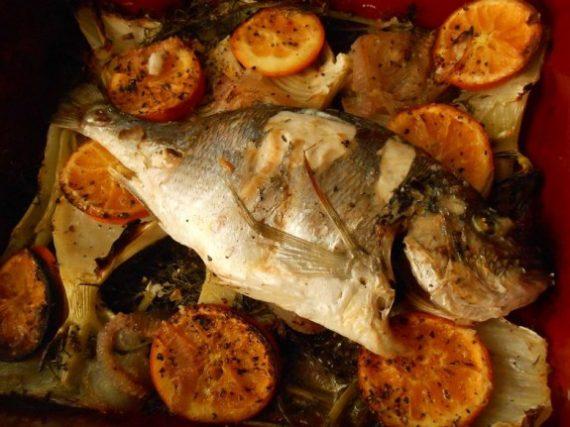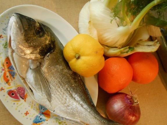 Ingredients 2 medium size sea bream 1 large fennel with leaves 2 sliced oranges 1 large sliced onion Juice and zest of 1 lemon 2 tablespoons olive oil salt & pepper