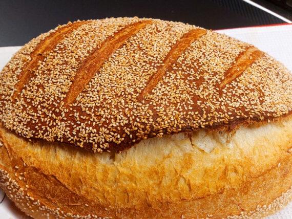 Συνταγή για σπιτικό ψωμί καρβέλι χωρίς φούσκωμα και χωρίς ζύμωμα, στη γάστρα με σουσάμι. Με αφράτη ψίχα και τραγανή κόρα, από τον Γιώργο Ζώλη.
