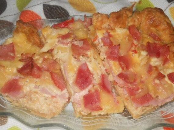 Αρχικά στρώνουμε τα μισά φύλλα σε ένα ταψί το οποίο πρώτα το έχουμε βουτυρώσει. Από πάνω απλώνουμε το τριμμένο ένταμ, το ψιλοκομμένο ζαμπόν, το μπέικον, το ψιλοκομμένο κρεμμύδι, τις πιπεριές κομμένες σε ροδέλες, το τυρί κρέμα, την ντομάτα κομμένη σε ροδέλες και κλείνουμε με τα υπόλοιπα φύλλα σφολιάτας.