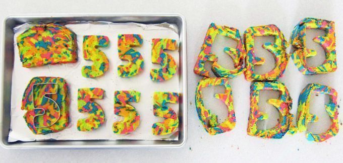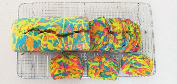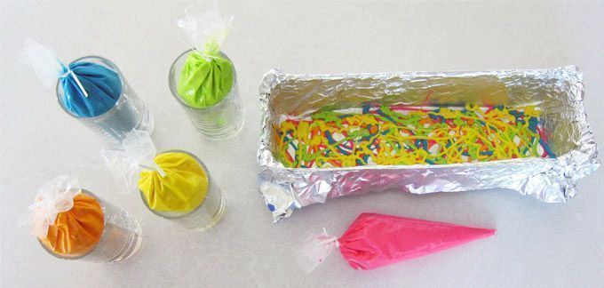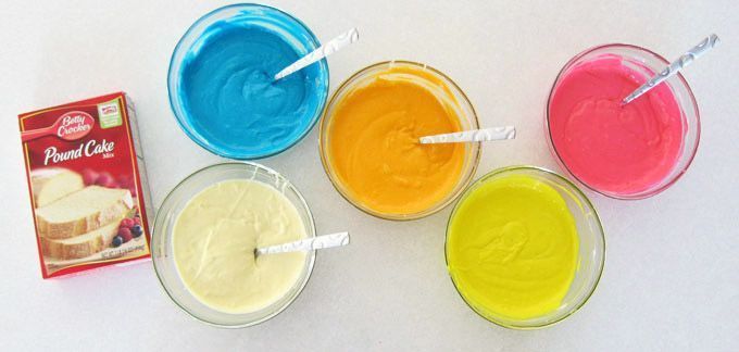 Φτιαχνετε δοσεις για δυο κεικ. στη συνέχεια, διαιρέστε το μειγμα σε διάφορα μπολακια προσθετοντας στο καθε μπολακι χρωμα ζαχαροπλαστικης. Εγώ διάλεξα να κάνω ροζ, κίτρινο, πορτοκαλί, μπλε και πράσινο, αλλά μπορείτε να κάνετε τα χρώματα που σας αρέσουν.