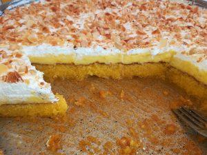 6 αυγά τα ασπράδια μαρέγκα 1/2 φακελάκι μπεικιν 375 γραμμ σιμιγδάλι ψιλό 1.1/2 ποτήρι νερού ζάχαρη 3 βανιλιες 1/4 του ποτηριού του νερού κονιάκ 1/4 του ποτηριού του νερού χυμό πορτοκαλιού 1/2 ποτήρι νερού αλεύρι για όλες τις χρήσεις Ξύσμα από ένα πορτοκάλι Εκτέλεση.