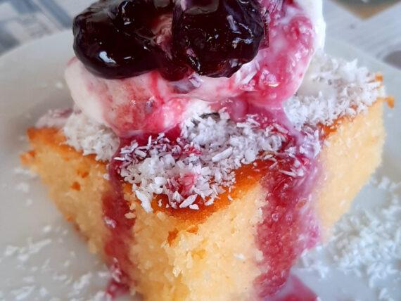 Εκτέλεση για το ραβανί Πολίτικο με παγωτό και γλυκό κεράσι