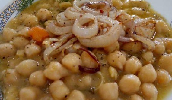 Ρεβίθια με καμένο λάδι δηλαδή σύβραση, με καραμελωμένα κρεμμύδια. Είναι η πιο νόστιμη και η πιο ιδιαίτερη συνταγή για ρεβίθια. Τα ρεβίθια είναι πολύ θρεπτικά και τις κρύες μέρες του χρόνου, είναι όσπρια που μας ζεσταίνουν.