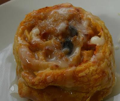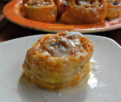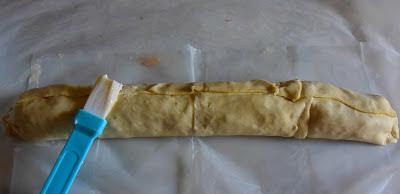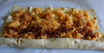 Βάζετε τις σταφίδες κατά μήκος του φύλλου από άκρη σε άκρη σε μία λωρίδα στο κέντρο του. Με μεγάλη προσοχή τυλίγετε τη σφολιάτα σε ρολό. Με ένα κοφτερό μαχαίρι κόβετε το ρολό σε 10 ίσα μέρη.