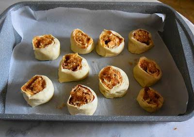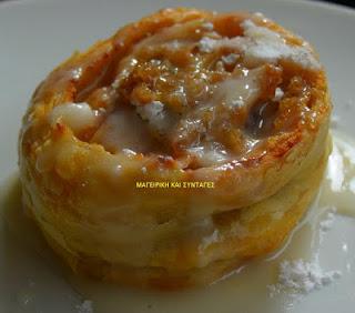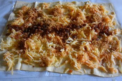 1 φύλλο σφολιάτας 2 μεγάλα κόκκινα μήλα τριμμένα 2 κουταλιές της σούπας βούτυρο λιωμένο 6 κουταλιές της σούπας μαύρη ζάχαρη 1 1/2 κουταλιά της σούπας κανέλα σε σκόνη 5 κουταλιές της σούπας σταφίδα σουλτανίνα 3 1/2 κουταλιές της σούπας επιπλέον μαύρη ζάχαρη για το φινίρισμα