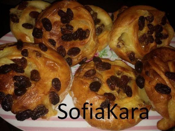 ΡΟΛΑΚΙΑ ΜΕ ΚΡΕΜΑ ΚΑΙ ΣΤΑΦΙΔΕΣ Ζύμη: 500 γραμ. αλεύρι 2 αυγά 1 φακ ξηρή μαγιά 120 γραμ λιωμένο βούτυρο 1 κ σ ζάχαρη 1 κούπα γάλα χλιαρό 1 κ.γλ αλάτι 1 βανίλια Κρέμα : 1/2 λίτρο γάλα 2 κρόκοι αυγού 100 γραμ ζάχαρη 50 γραμ αλεύρι 2 βανίλιες 1 κουταλιά σούπας βούτυρο 1 κούπα σταφίδες που τις μουλιάζουμε σε 1 κούπα κονιάκ για μία ώρα περίπου, και τις έχουμε στραγγίξει καλά! Εκτελεση Σε ενα μπολ ανακατευουμε τη μαγια με το αλευρι και προσθετουμε σιγα σιγα τα υπολοιπα υλικα! Ζυμωνουμε καλα και σκεπαζουμε τη ζυμη για να φουσκωσει! Ετομαζουμε την κρεμα και ανοιγουμε τη ζυμη σε ενα παραλληλογραμμο φυλλο! Απλωνουμε την κρεμα επανω στο φυλλο και βαζουμε τις σταφιδες!Τυλιγουμε σαν χαλι απο τη στενη πλευρα και κοβουμε ανα 2 εκ ! Τα βαζουμε στο ταψι με τη λαδοκολλα ,τα αφηνουμε να ξεκουραστουν και ψηνουμε στους 180 β μεχρι να ροδισουν! Τελος βαζω σε ενα κατσαρολακι λιγη μαρμελαδα ροδακινο με μια κουταλια της σουπας νερο και το βραζω λιγο! Μολις κρυωσει αλειφω τα ρολακια και ειναι ετοιμα για φαγωμα! Δοκιμαστε τα! Δεν παχαινει ομορφαινει!