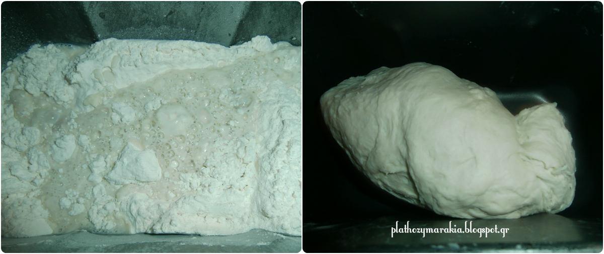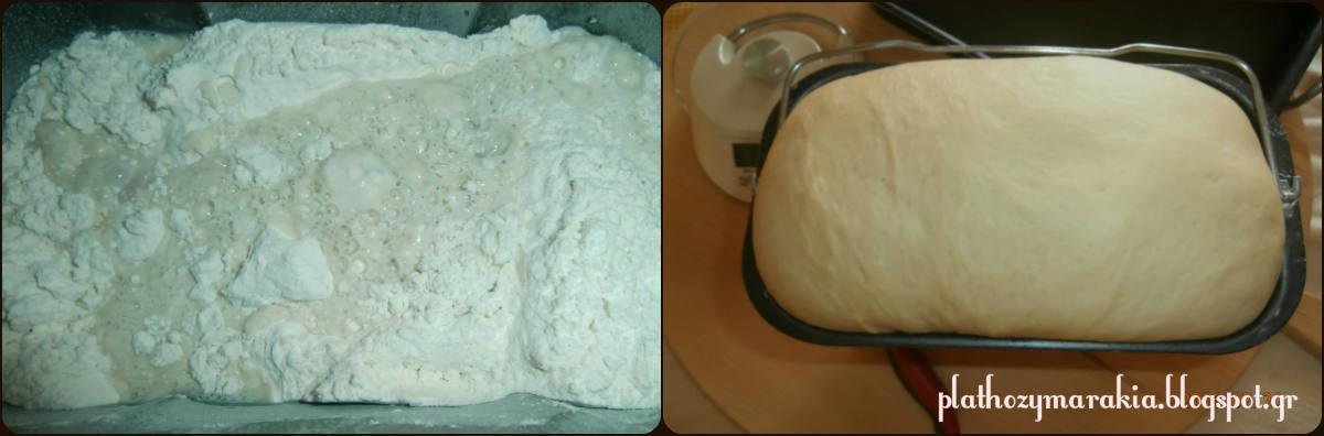 700-750 γρ αλεύρι 60 γρ βούτυρο ή λάδι 200ml ζεστό νερό 250 ml ζεστό γάλα 20 γρ μαγιά φρέσκια ή 7 γρ ξερή μαγιά 2 κουταλάκια του γλυκού αλάτι 1 κουταλιά της σούπας ζάχαρη Μέθοδος Ανακατεύουμε στον κάδο του αρτοπαρασκευαστή ή σε ένα μπολ , το αλεύρι με το αλάτι και στη συνέχεια προσθέτουμε το βούτυρο σε θερμοκρασία δωματίου, κομμένο σε τετράγωνα και ζυμώνουμε μέχρι η ζύμη σε υφή άμμου Κάνουμε μια τρύπα στο κέντρο της ζύμης, ρίχνουμε τη μαγιά που την έχουμε διαλύσει στο ζεστό γάλα με την ζάχαρη . Ζυμώνουμε και σταδιακά προσθέτουμε και το ζεστό νερό λίγο λίγο
