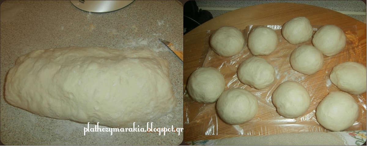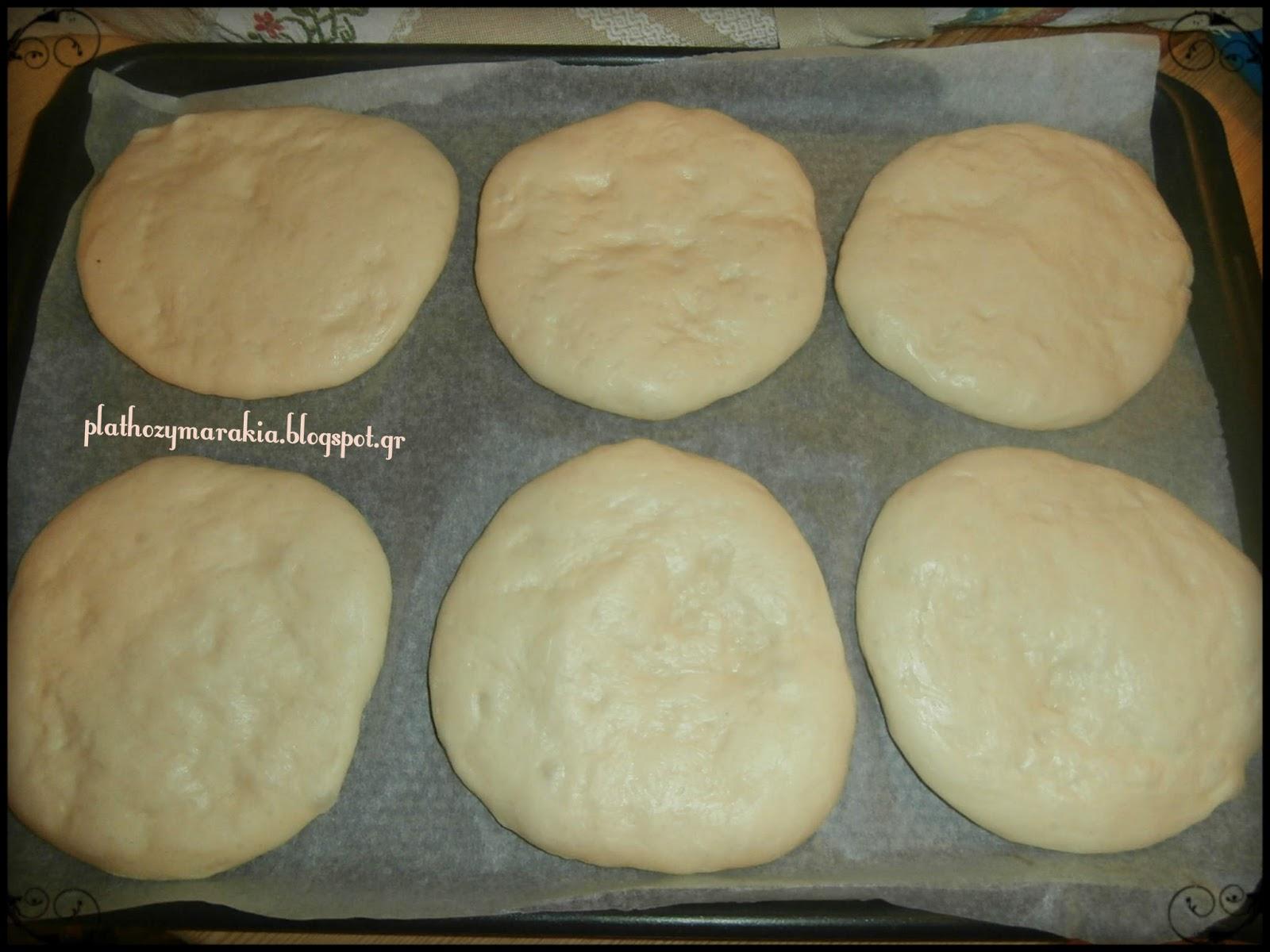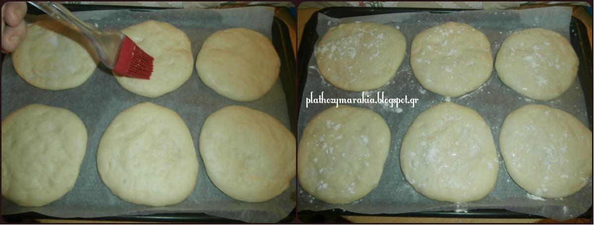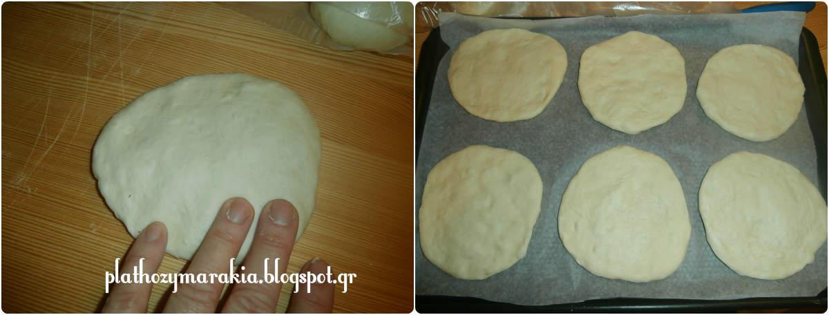 Μετά από μια ώρα, μεταφέρετε τη ζύμη σε πάγκο εργασίας με αλεύρι , μοιράζουμε την ζύμη σε 12 ίσα κομμάτια 90-100 γρ το καθένα . Τεντώνουμε με το πλάστη ή πατάμε την ζύμη με το χέρι να ανοίξει σε σχήμα πιτούλας πάχους 1-2 cm, και τα βάζουμε στο ταψί. Τα ψωμάκια δεν θα πρέπει να έχουν τέλειες άκρες, θα έχουν μια πιο ρουστίκ όψη .. Βουρτσίστε την επιφάνεια με λίγο γάλα και πασπαλίζουμε με λίγο αλεύρι.