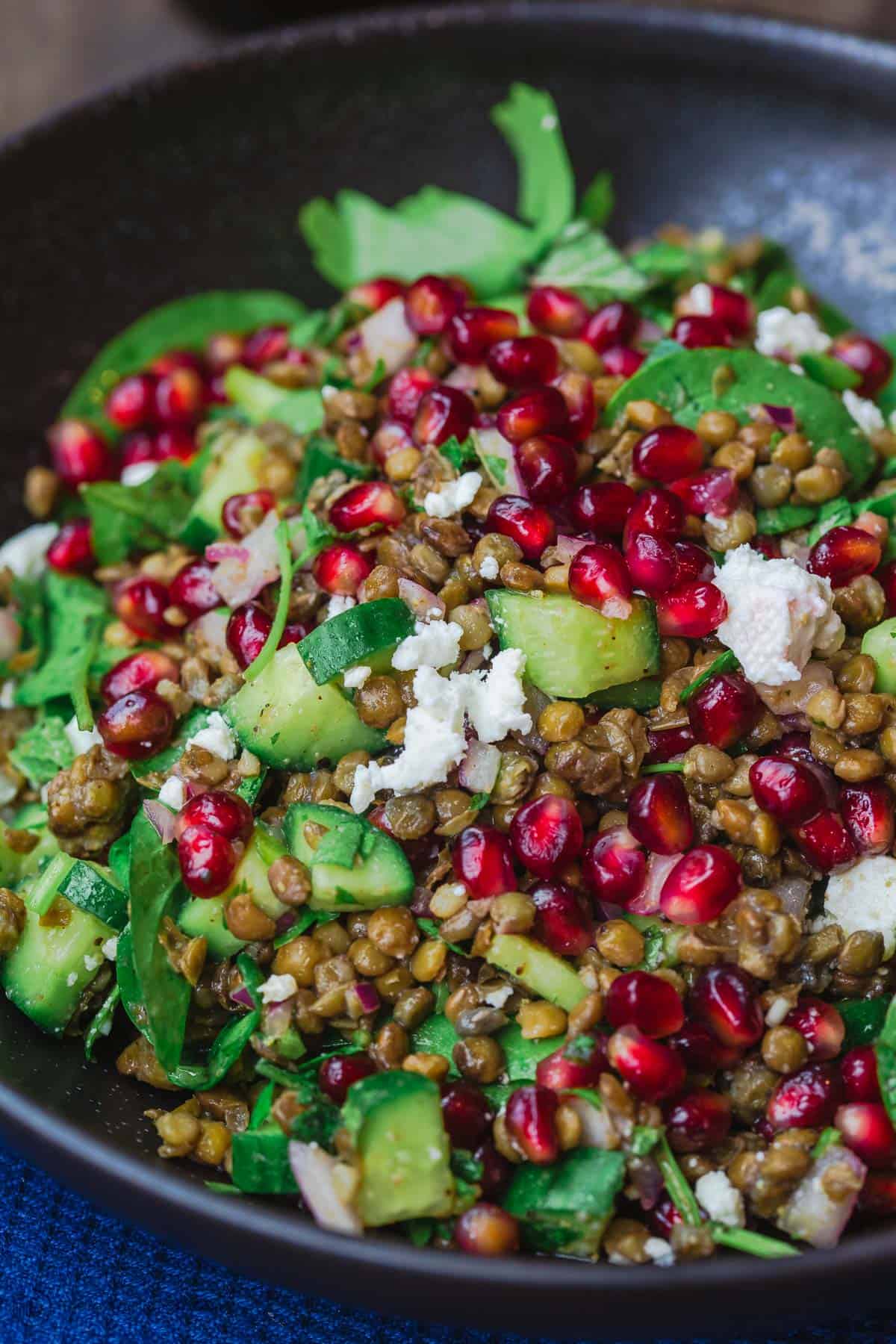 Μια μεσογειακή και πολύ υγιεινή συνταγή για σαλάτα με φακές, σπανάκι, αγγούρι, μαϊντανό, ρόδι και φέτα που θα μας γεμίσει ενέργεια. Μία πολύ θρεπτική σαλάτα συνοδευμένη από σάλτσα μελιού με κύμινο. Ιδανική για να την σερβίρουμε με ψητό ψάρι ή κρέας άλλα και σαν ένα υγιεινό και ελαφρύ βραδινό. Αν θέλετε μπορείτε να εξαιρέσετε την φέτα και να έχετε το απόλυτο vegan πιάτο. Πάμε να δούμε πως θα φτιάξουμε αυτή την εξαιρετική σαλάτα!