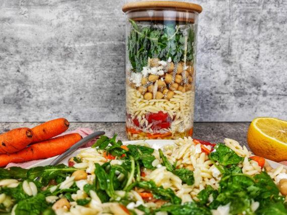 Τώρα που οι θερμοκρασίες έχουν ανέβει επικίνδυνα κανείς δεν θέλει να ανάβει φούρνο ή να περνάει πολύ χρόνο στην κουζίνα. Αυτή η σαλάτα-γεύμα σε βαζάκι (επί 2) είναι ιδανική για αυτές τις μέρες. Την ετοιμάζετε σήμερα και έχετε φαγητό για 2 μέρες.