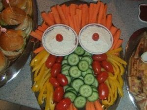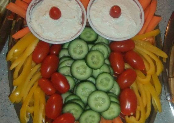 Εκτέλεση Κόβουμε τα καρότα μας και τις πιπεριές σε μπαστουνάκια. Κόβουμε τα αγγούρια σε λεπτές ροδέλες. Φτιάχνουμε την τυροσαλάτα. Βάζουμε στο μπλέντερ την φέτα, το γιαούρτι,το λιωμένο σκόρδο, το ελαιόλαδο, τη ρίγανη και ανακατεύουμε. Φτιάχνουμε την κουκουβάγια όπως στη φωτογραφία.